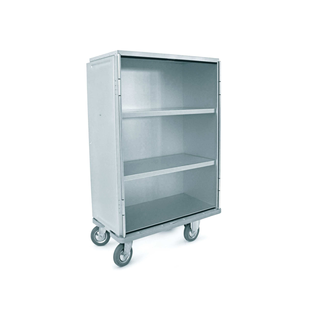De legplanken zijn uitneembaar en kunnen verticaal tegen achterwand vastgezet worden, maar de legplanken zijn niet verstelbaar. De transportwagen is door middel van twee invallende 270° wendbare vleugeldeuren afsluitbaar welke bij het openen vastgezet kunnen worden door middel van magneten aan weerszijden. Daarnaast is de transportwagen voorzien van een omlopende stootrand onder en duwbeugels aan de kopse zijdes. Standaard voorzien van verzinkte wielen Ø200mm waarvan twee bokwielen en twee zwenkwielen geremd.