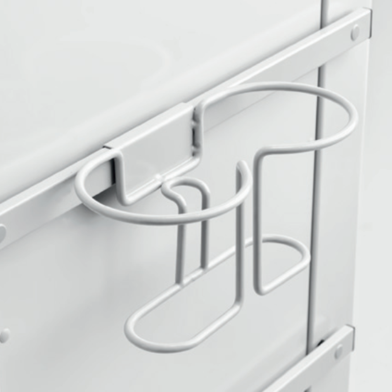 Met deze flessen standaard kunnen flessen en vloeistoffen veilig en overzichtelijk worden opgeslagen bij de medische trolley. De houder dient aan de zijkanten van de trolley bevestigd te worden, waardoor waardevolle werkruimte op de ladewagen zelf behouden wordt. In de standaard kunnen twee flessen naast elkaar worden opgeslagen. De stevige bevestiging zorgt ervoor dat de flessen stevig en rechtop blijven staan, ook tijdens verplaatsing van de ladewagen. Middels deze standaard kunnen de flessen altijd binnen handbereik worden bewaard en snel gepakt worden tijdens een medische behandeling.