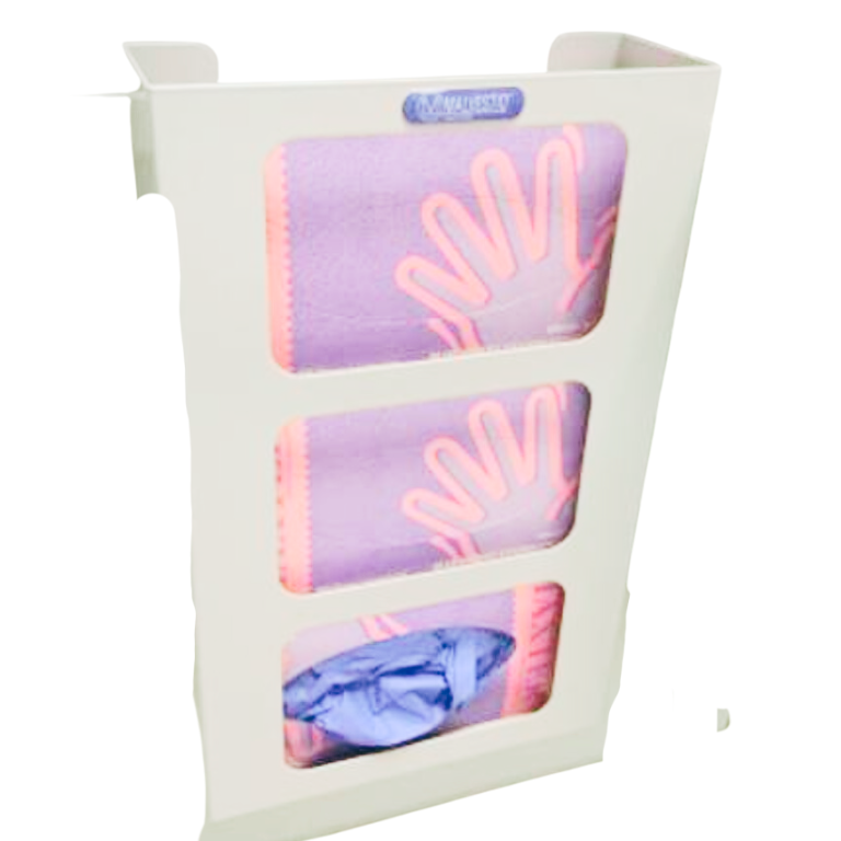Om altijd medische handschoenen in de buurt te hebben, is deze standaard zeer geschikt om te bevestigen aan de medische trolley. Deze handschoenenstandaard kan zowel aan de aanhanglijsten bovenop als aan de zijkanten van de wagen worden bevestigd. Het bakje van de handschoenen kan in deze standaard geplaatst worden, waarna gemakkelijk bij een procedure handschoenen uit deze box gehaald kunnen worden. Wanneer een doosje met handschoenen leeg is, kan deze gemakkelijk eraf worden geschoven en kan er een nieuwe tussen geplaatst worden.