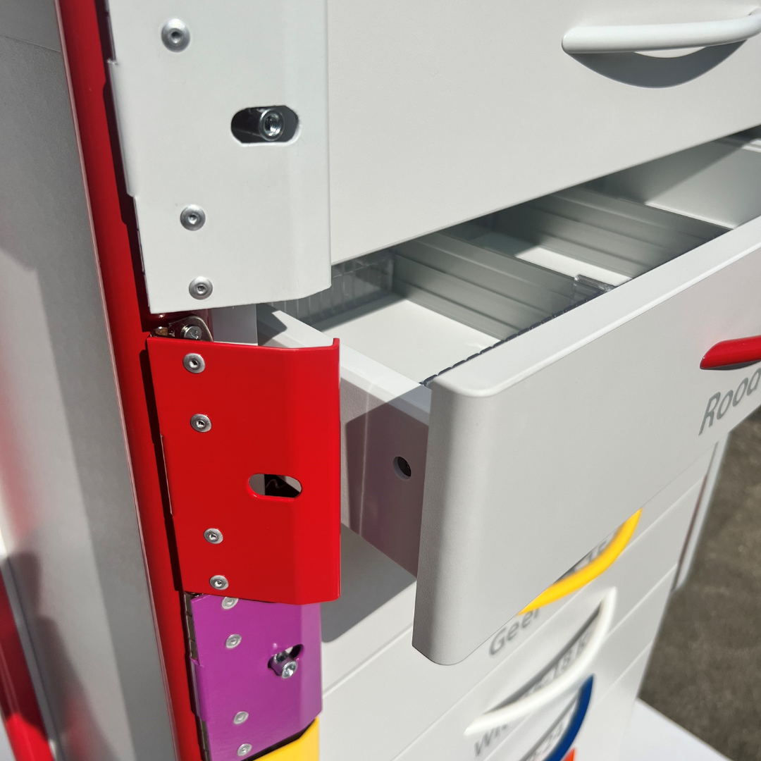 De wagens zijn standaard uitgerust met vier dubbele zwenkwielen (waarvan 2 geremd) om soepel te manoeuvreren. De aluminium onderdelen zijn leverbaar in vele diverse kleuren. Ook ladefrontjes zijn eventueel in kleur verkrijgbaar. De lades zijn voorzien van softclose telescoopgeleiders en qua hoogte zelf samen te stellen.