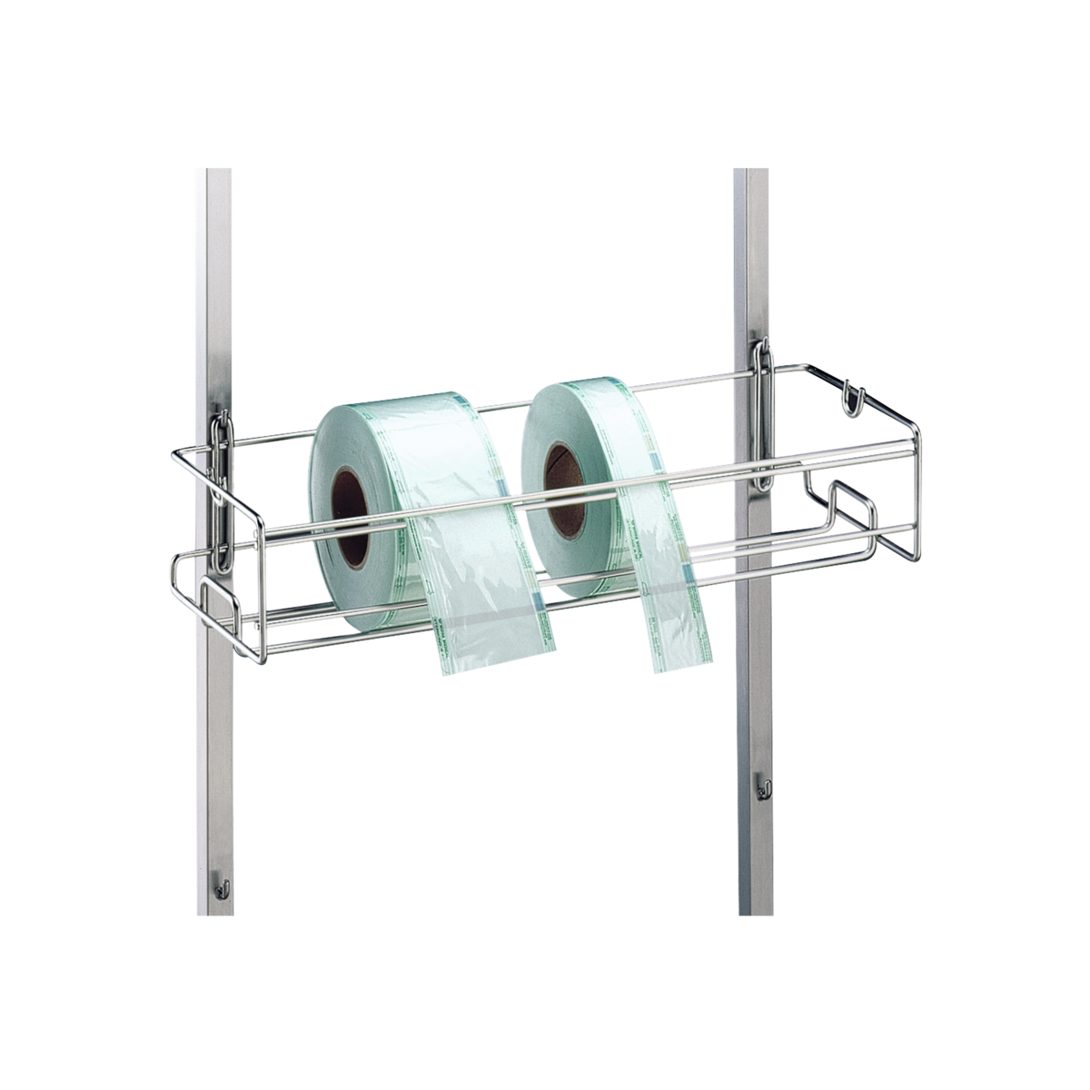 Stabiele, zelfdragende en hygiënische constructie, volledig van hoogwaardige, elektrolytisch gepolijste en braamvrij verwerkte roestvrij stalen draad. Houder voor het aanhangen aan muurrails, haakwagens of werktafel, bestaande uit een frame van roestvrij draadstaal voor het instellen resp. inhangen van folierollen. De rollen worden naar keuze op een in het bodembereik ingelast geleidingsframe van roestvrij draadstaal los neergezet of met behulp van een standaard ronde buis in halfronde uitsparingen in de bovenste rand van de houder ingehangen.