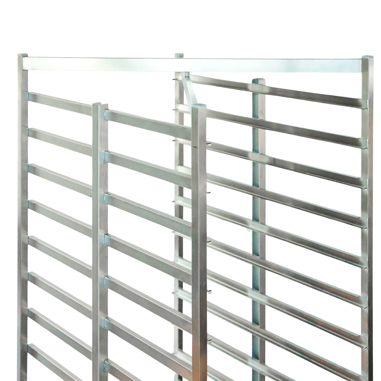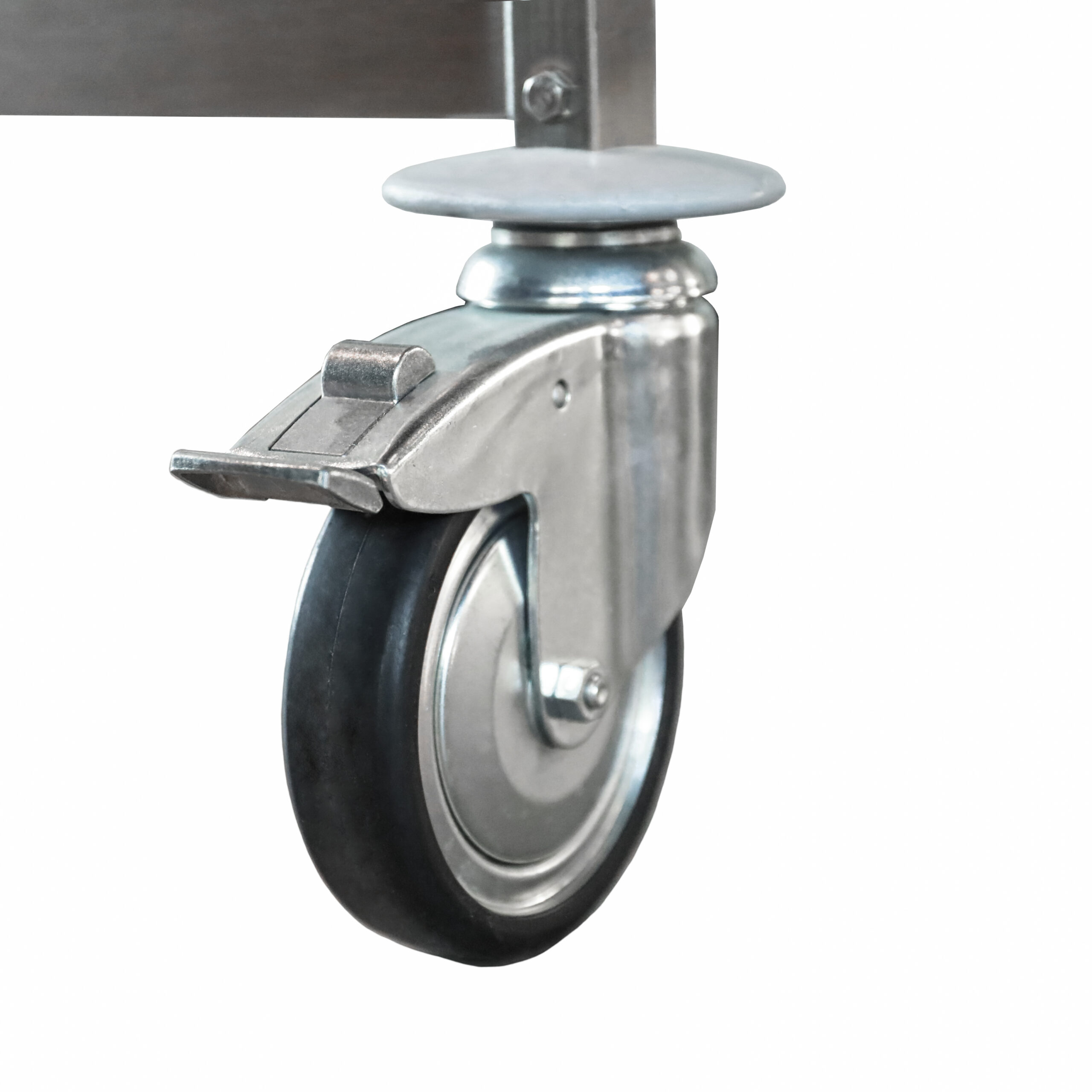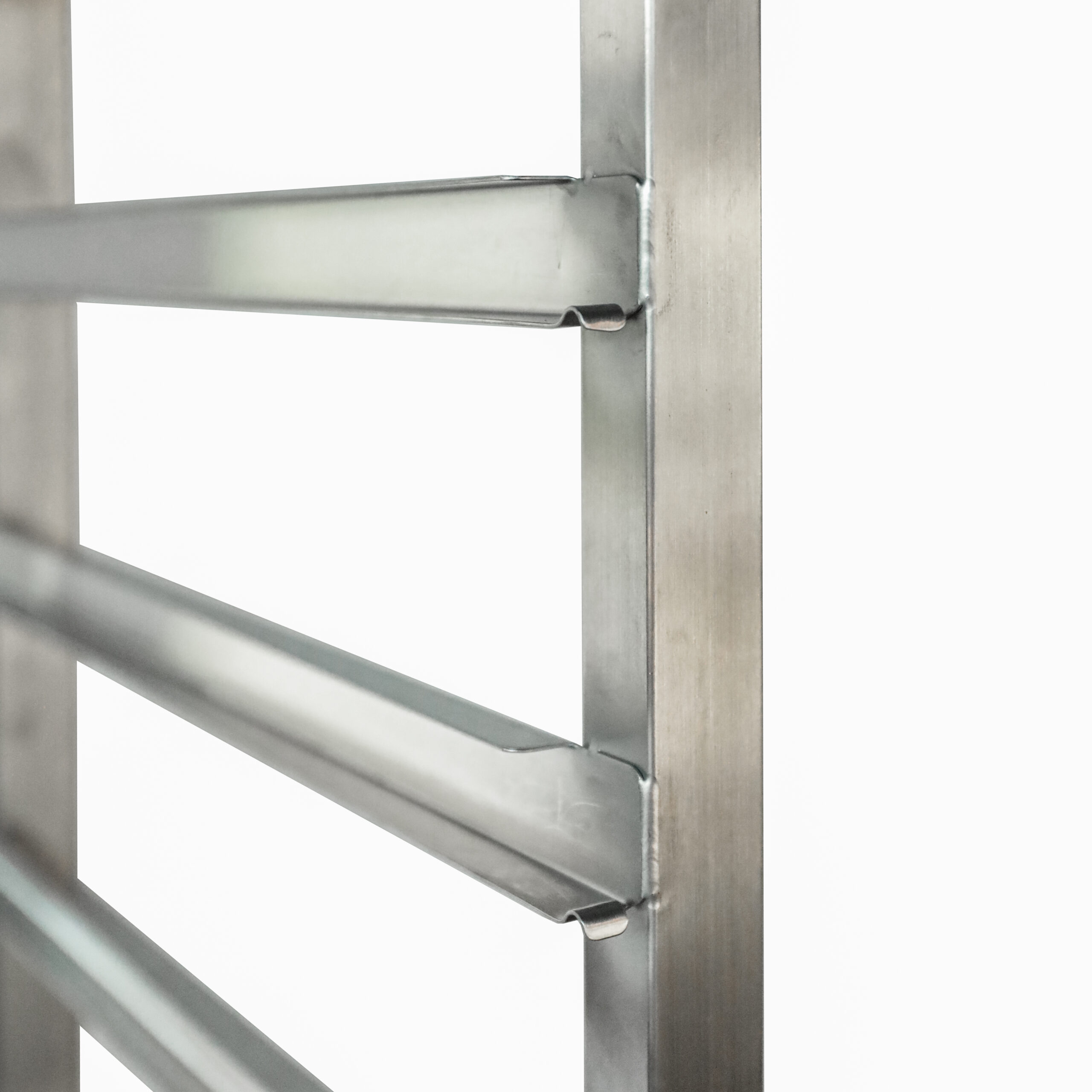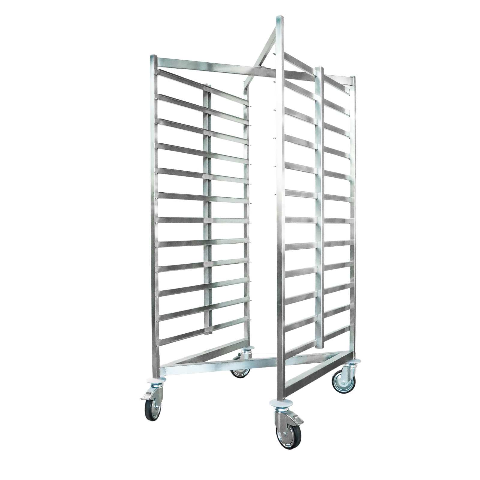 Roestvrijstalen harmonicawagen met U-profielen voor het transport van draadmanden en draadroosters.