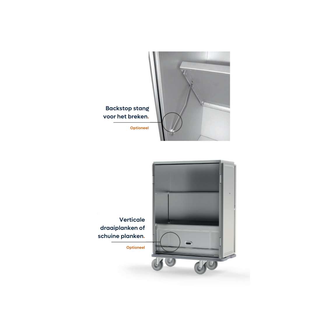 | Artikel CMN204 | Breedte 1230 | Diepte 630 | Hoogte 1750 | Wielen Ø 200 | Inhoud 900L |