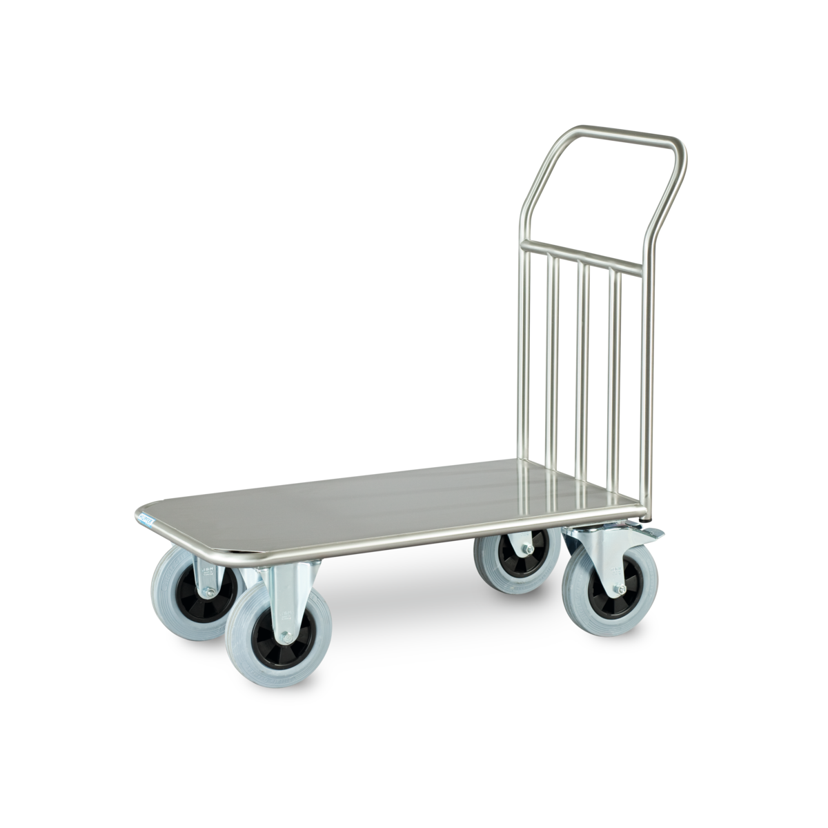 Wagen in stabiele, zelfdragende en hygiënische constructie van hoogwaardig roestvrij staal. Complete frameconstructie van ronde buizen. Platform uit 5 ronde buizen met vastgelast roestvrij plaatstaal. Aan één zijde, vast met het platform gelaste schuifbeugel van vierkante buis, ergonomisch met een hoek van 30°, zorgt voor gemakkelijk manoeuvreren. Schuifbeugel met geïntegreerde voorzijde van ronde buizen. Wagen verrijdbaar op 2 zwenkwielen met blokkeerremmen en 2 bokwielen, met meermaals geschroefde aanschroefplaten bevestigd.