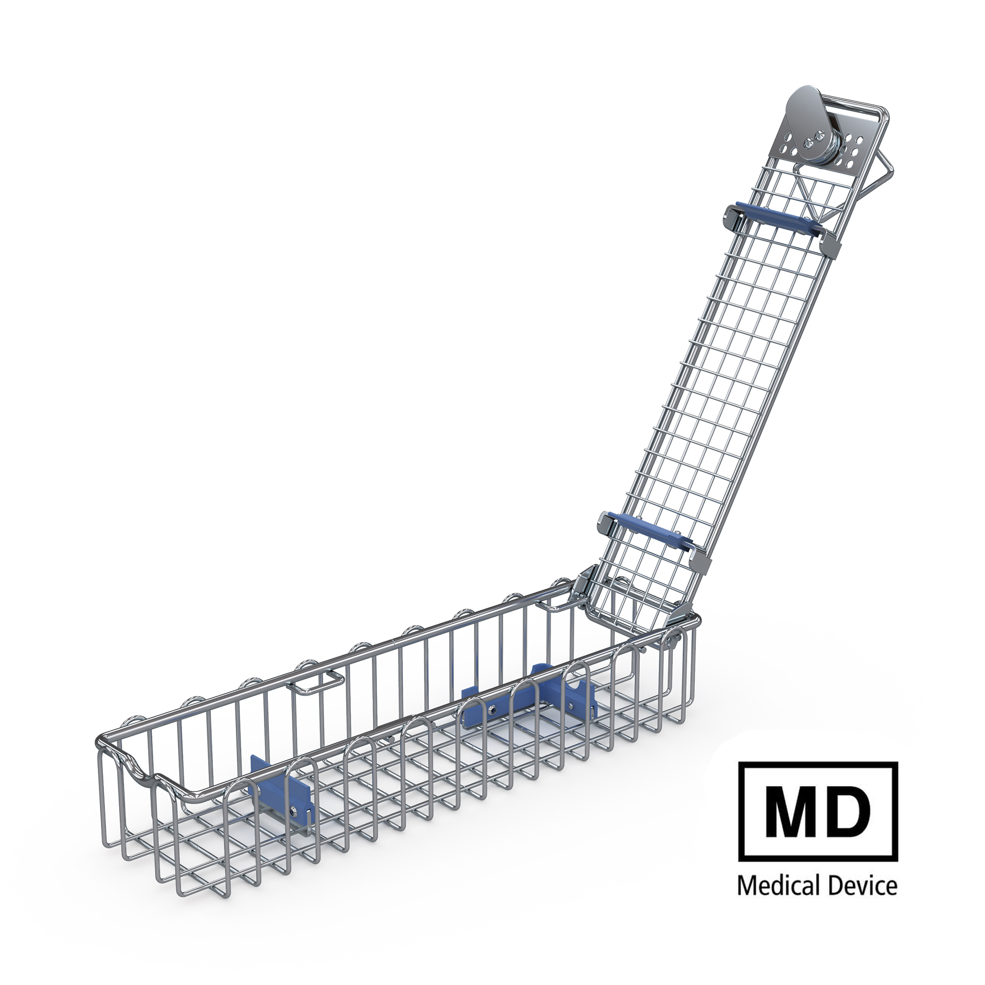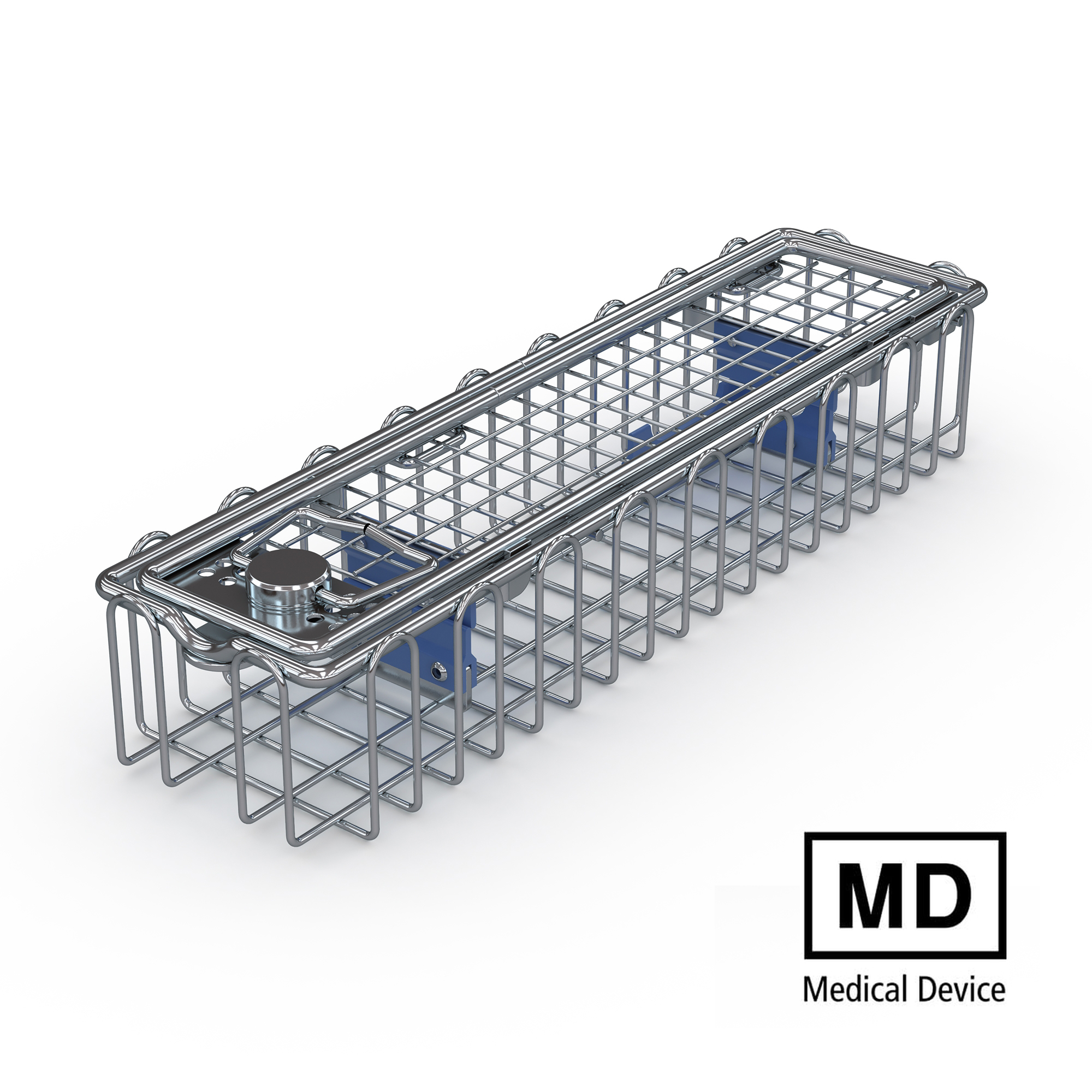 Zeefkorf van gesloten draadlussen met bovenframe van roestvrij staaldraad, deksel van gelast gaas met draadframe en veilige draaisluiting. Een stabiele oculairhouder met verwisselbare siliconen elementen in de korf zorgt samen met de siliconen elementen aan het deksel voor een perfecte fixatie en optimale bescherming van de endoscoop-optica ook tijdens het reinigen, desinfecteren en steriliseren.