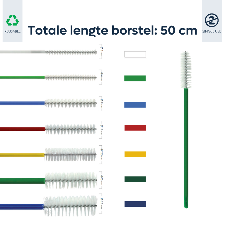 Reinig kanalen en holle instrumenten grondig met deze semi-flexibele, enkelzijdige reinigingsborstel; beschikbaar in zowel single use als reusable variant. Met een totale lengte van 50 cm bereikt de borstel lastig toegankelijke delen voor een effectieve reiniging.