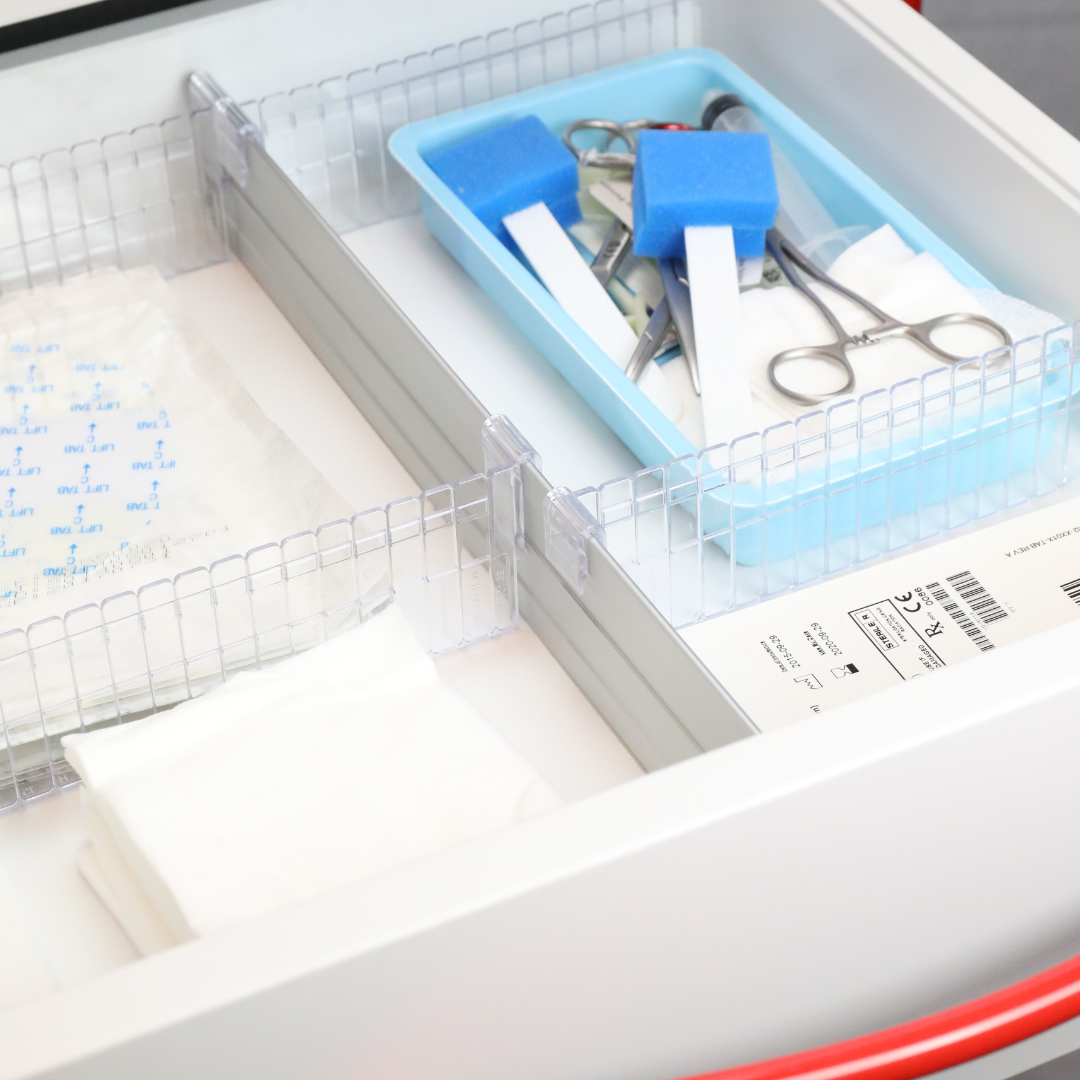 De wagens kunnen worden uitgebreid met diverse accessoires, zoals een stootrand, een plateau voor de laptop, een afvalbak, houders voor handschoenen, infuus, naaldenbox, zeeppompjes of alcohol. Er is een hele reeks aan kleuren mogelijk voor de aluminium onderdelen en wist u dat de wagen bestickerd kan worden met een tekst naar wens? Bijvoorbeeld met de tekst Verbandwagen, SEH of IC, zodat het altijd duidelijk is voor welke afdeling de wagen is bedoeld. Daarnaast kunnen de handgrepen ook in meerdere verschillende kleuren worden uitgevoerd, bijvoorbeeld als deze extra vrolijk moet zijn voor de kinderafdeling.