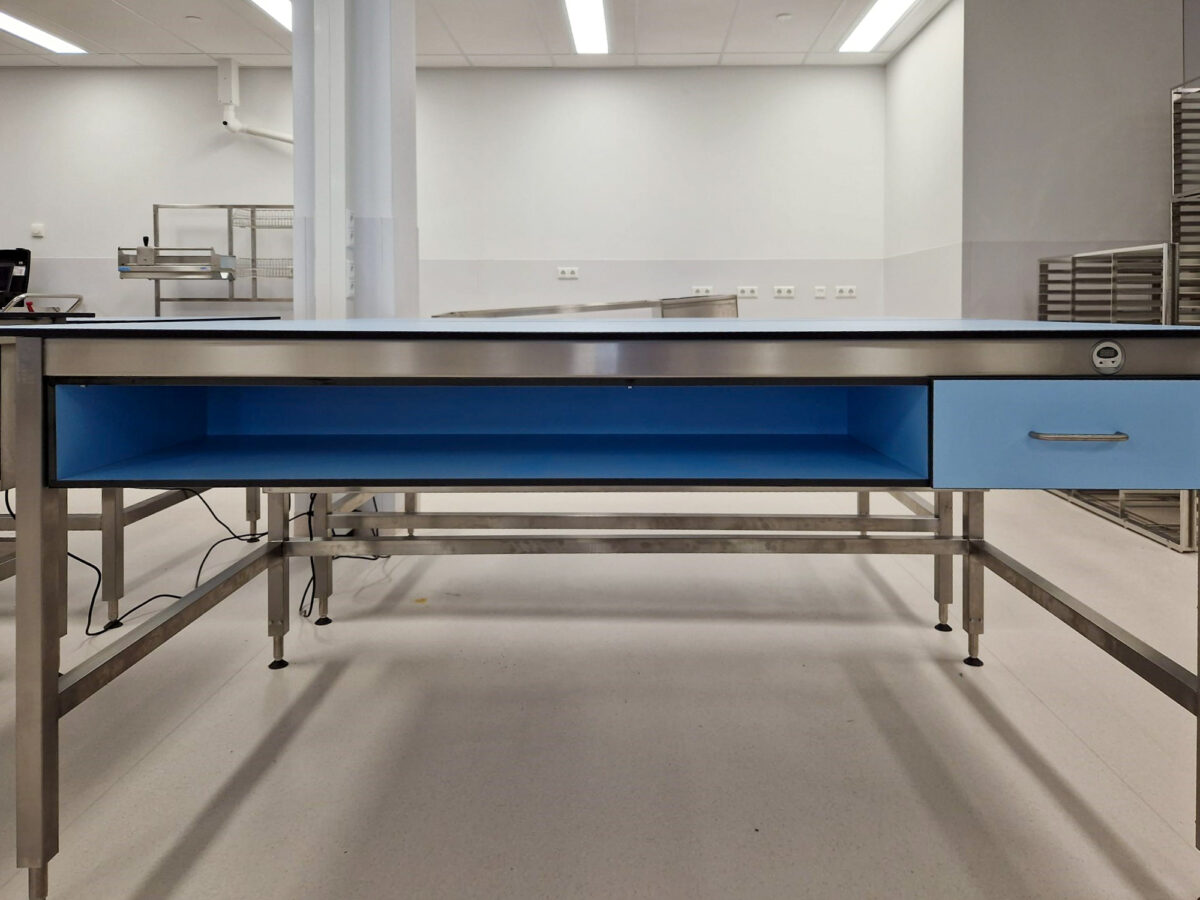 De hoog/laagtafels werden voorzien van beeldschermhouders, een opbergvak voor inpakmateriaal en een dichte lade. De sealtafel werd compleet naar wens ingericht; voorzien van een opstand met diverse opbergmogelijkheden, een laminaatsnijder en vakverdeling onder de tafel voor het opbergen van het laminaat.